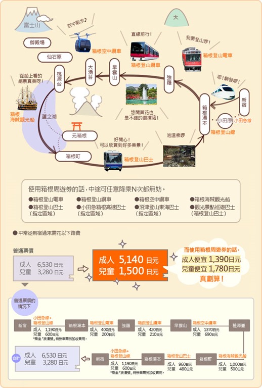 另要注意的就是那时2010年箱根周游券是5000日圆,到现在2018年已经涨到了5140日圆,浪漫特快列车也从870日圆涨到了1090日圆,这种涨势你看了一定会想要趁早来箱根一趟的。