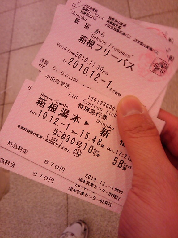 平常读日本旅游信息时总会读到这讯息,但我猜大部分人应该都是很快跳过吧,我猜也不会有人像我这么在意这个时间的,错过小田急浪漫特快列车的展望席,浪费了870日圆还不算什么,重点是那是人生难得仅有的蜜月旅行,这么重要的时间与重要的人出游,碰上了这等事,任谁都会错愕不已的,可能是事发前晚在东京迪斯尼玩太累了,完全忘记要将PHS烂手机调快一小时,就直接设定闹钟,等到早上一觉起来就发现,惨了,我们订了展望席的那班小田急浪漫特快列车已经开走了,随后不想再花870日圆坐特急列车去箱根了,改乘一般车到箱根。
