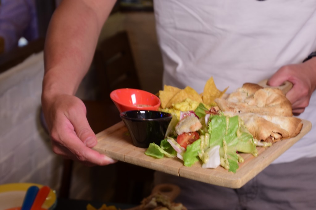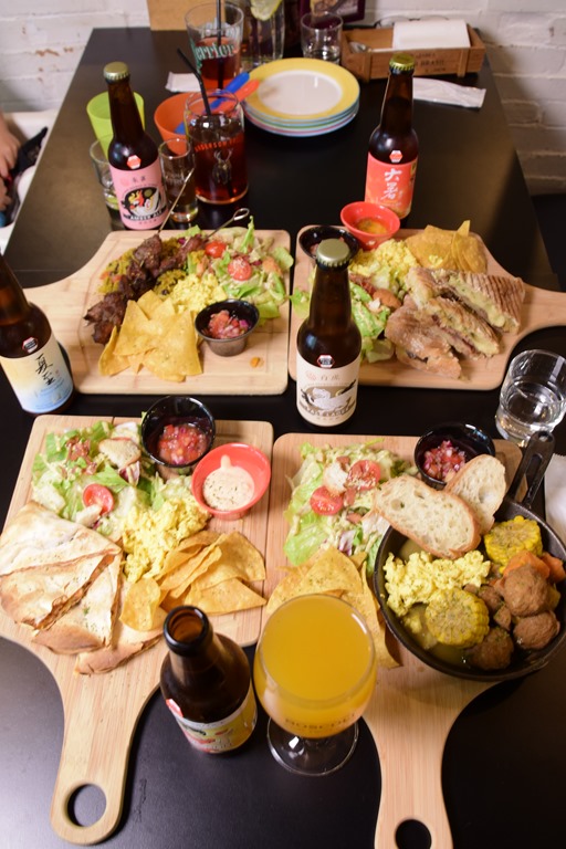 看看这摆满整桌的食物,给四个大人吃都很充分啊,这里头有古巴三明治早午餐、卡莎蒂亚早午餐、加勒比海炖肉早午餐及斑点公鸡遇上火烤肉串。因为是工作达人,我们是很认真工作的,每一个东西都要认真品尝一下。这里料理手法可说是运用食材与香料的组合创造出新一代的美食联合国!充满了殖民时的欧陆风情,并且灵活使用海鲜及蔬菜以及大量的辛香料。从牙买加的烤肉、古巴的三明治和炖肉、美国南方的Cajun,以及各式墨西哥菜,风味浓厚且香料浓郁,创造多元丰富的层次感,而搭配料理的各种沾酱味道酸甜带辣劲不仅开胃,更提升了味蕾的不同次元。